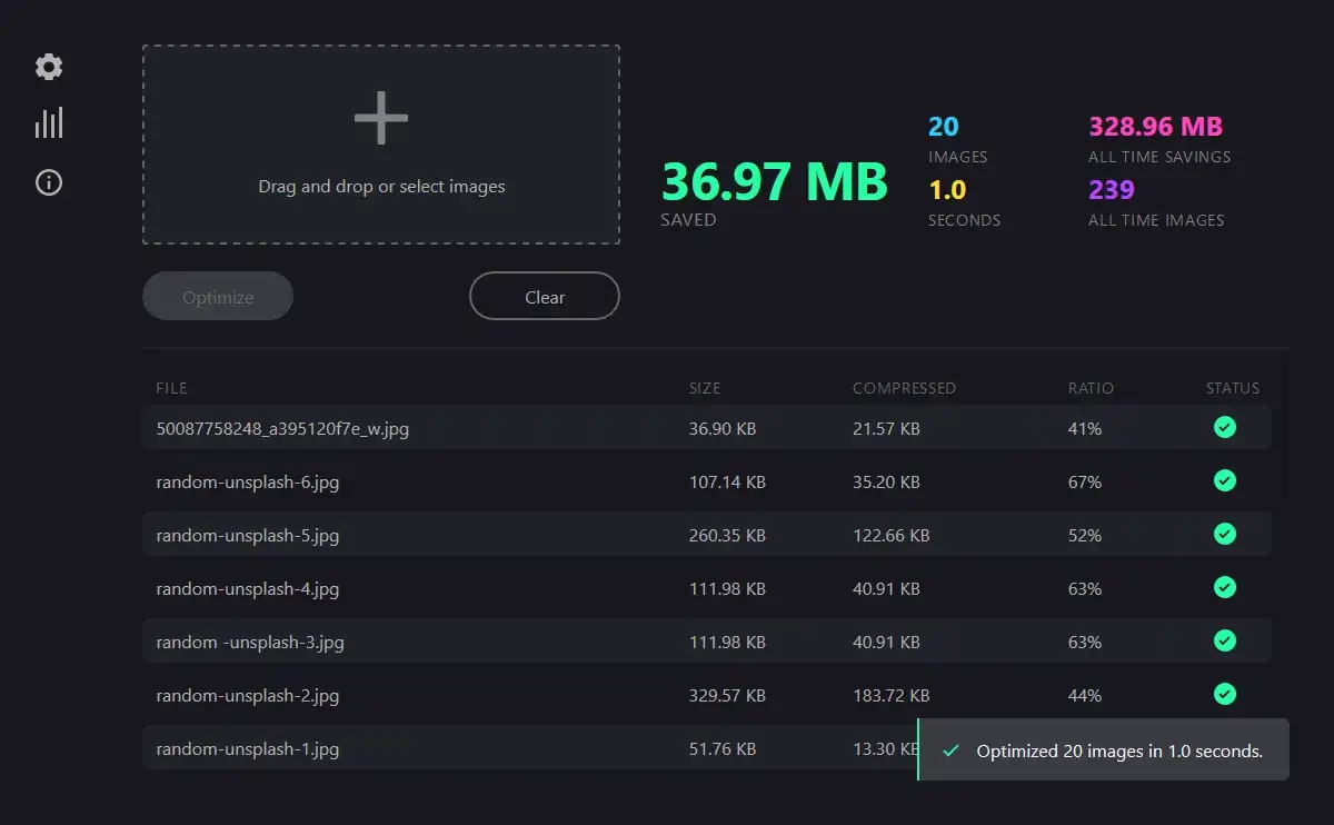 CommunityShowcase옵티머스(Optimus)버전: v2.11.0옵티머스(Optimus) Optimus 데스크탑 이미지 최적화 애플리케이션입니다. WebP, JPEG, PNG 이미지 포맷 형식간의 변환 및 압축을 지원합니다.
